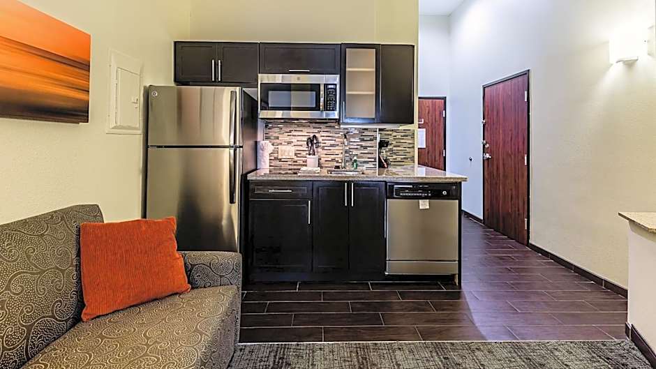 This is a wheelchair accessible suite with a seating area, kitchen, and cable TV.